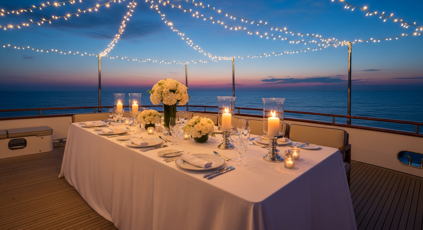 Choose from a 3-course seated dinner prepared by our on-board chef or a relaxed cocktail hour format with circulating canapes and food stations. Both options include premium table settings with white linen, crystal glassware, and fresh flower centrepieces.